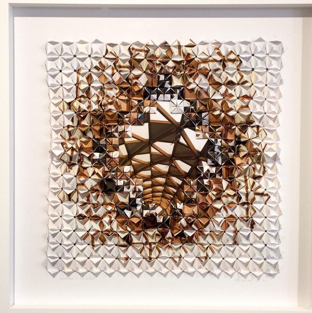A three-dimensional tessellated collage: Photographs, decorative papers. This work expresses in three dimensions the textures and forms of the roof over Coventry’s Herbert Museum, designed by engineers Alan Baxter Associates and constructed in 2009.